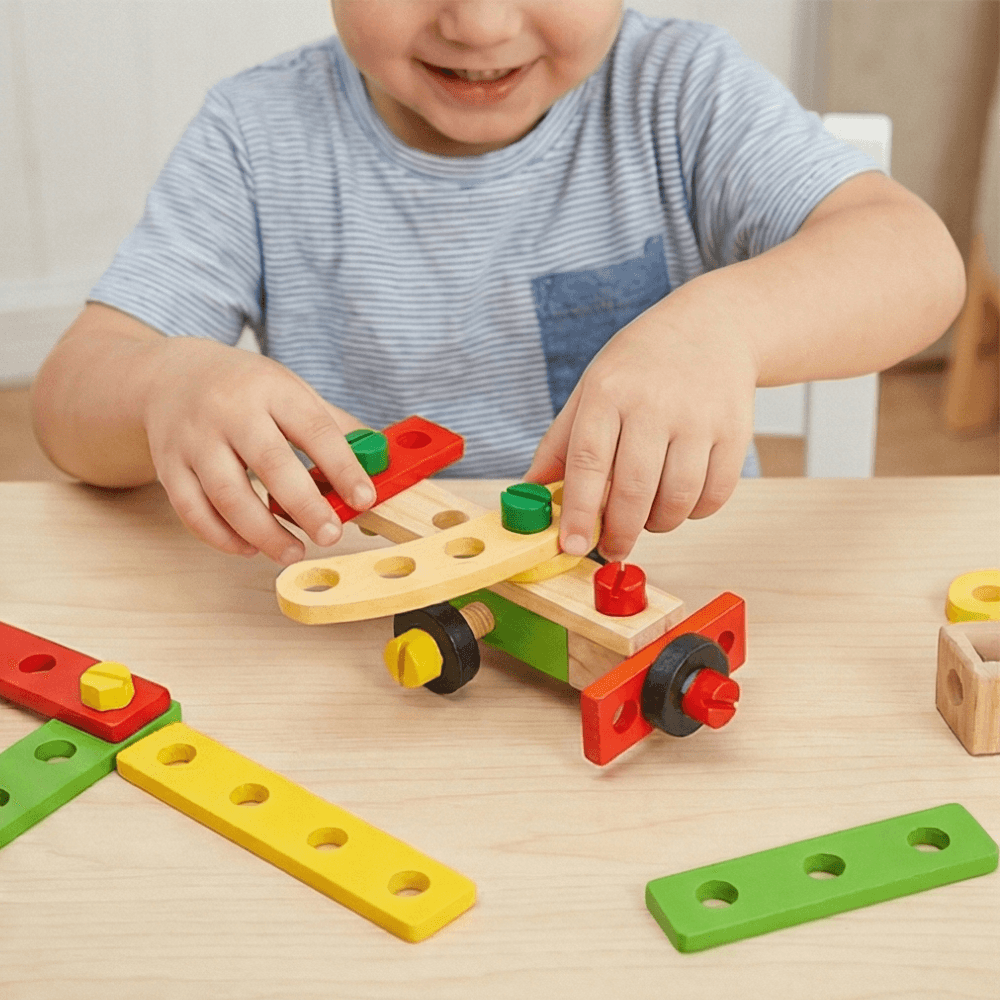 تقوية المهارات الحركية الدقيقة : تتطلب عملية تدوير الصامولة على البرغي أو استخدام المفك تنسيقاً دقيقاً بين حركة الأصابع والمعصم. هذه الممارسة المنتظمة تحسن مهارة اليدين وخفتها، وهي كفاءة ستساعده بشكل مباشر لاحقاً عند تعلم الكتابة ومسك القلم.