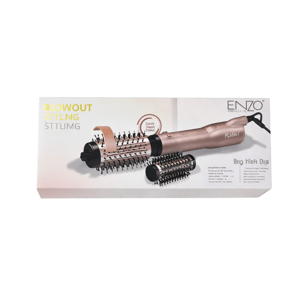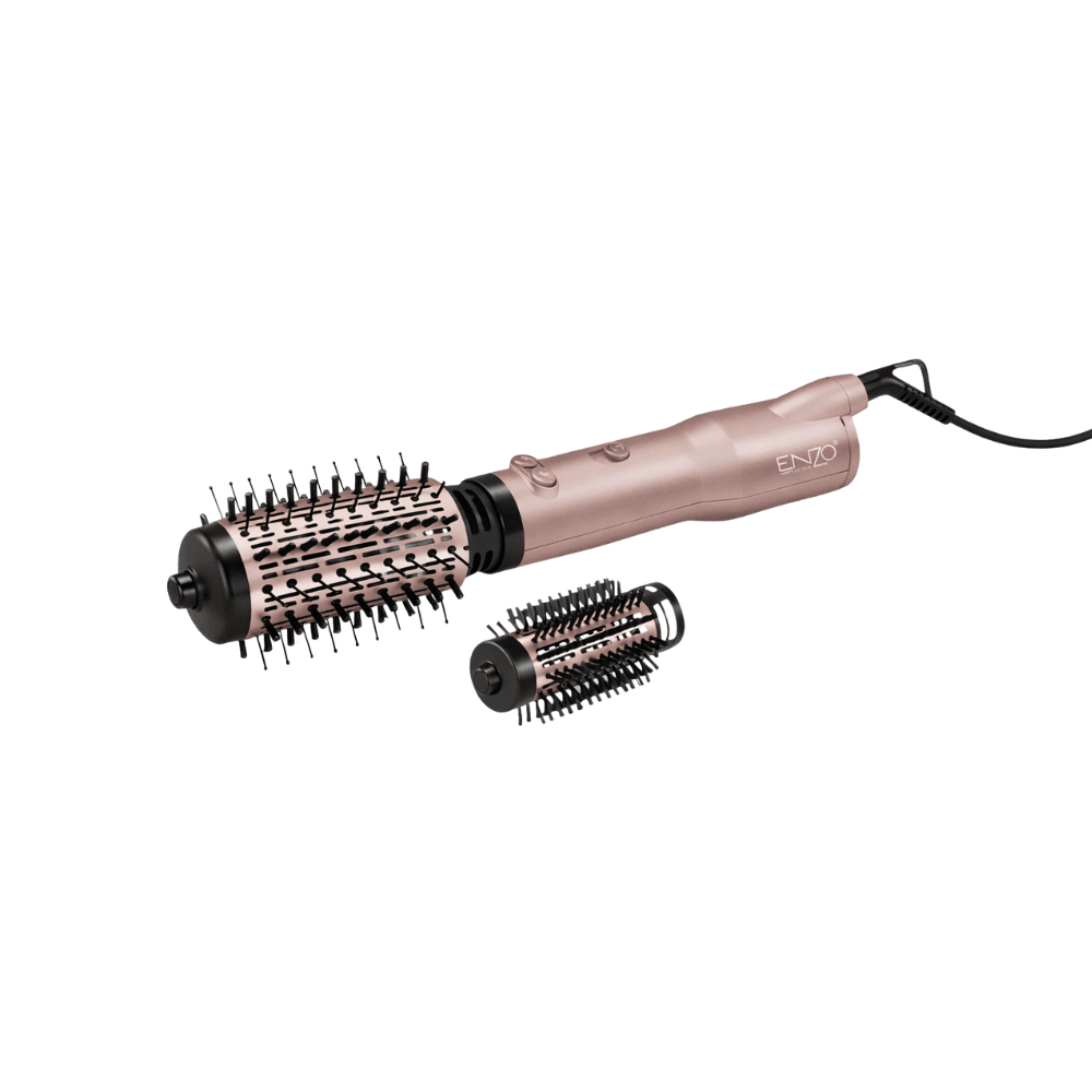 فرشاة هواء ساخن دوّارة ENZO، المزودة بملحقين قابلين للتبديل، هي جهاز تصفيف مصمم لتجفيف الشعر وتصفيفه في خطوة واحدة، مع إضافة حجم طبيعي ولمسة نهائية مرتبة. يُنصح باستخدام فرشاة هواء ساخن دوّارة عند الرغبة في الحصول على براشينغ منتظم دون استعمال مجفف شعر وفرشاة تقليدية بشكل منفصل. هذا النوع من الأجهزة يُبسّط روتين العناية بالشعر، ويقلل الحركات المتكررة المسببة للتعب والإجهاد الميكانيكي للشعر.