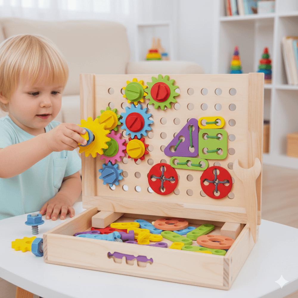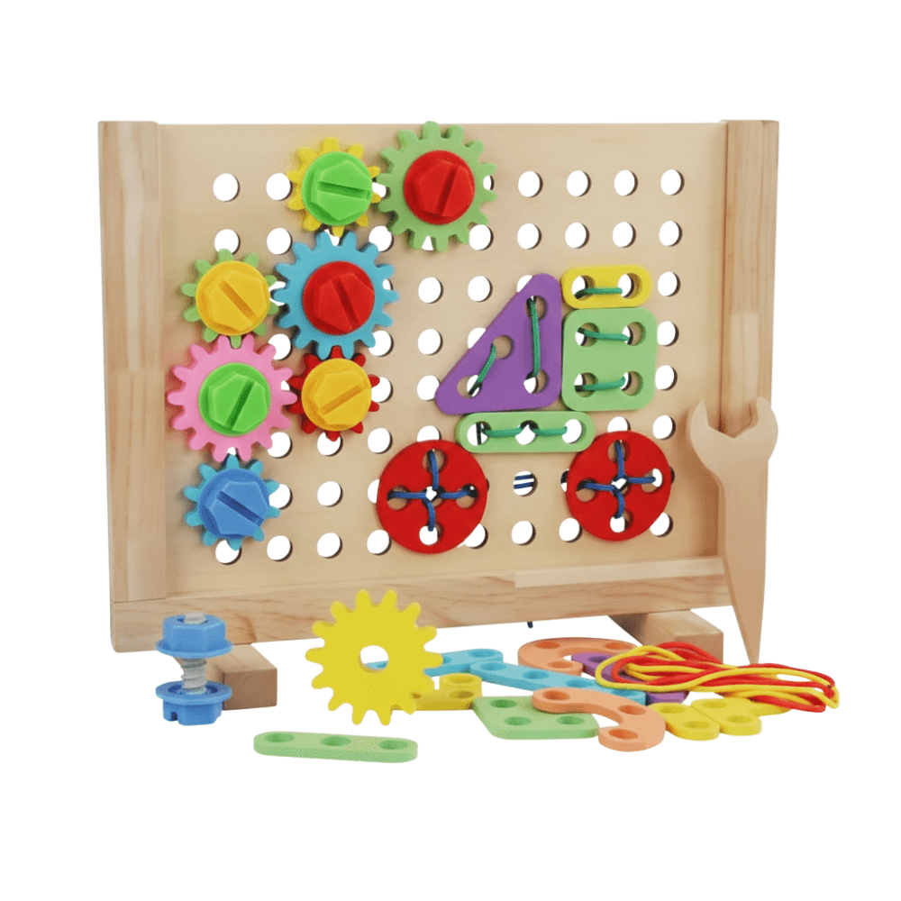 ورشة كاملة ودقيقة: اكتشفوا جميع العناصر المرفقة لتنويع تمارين الإيقاظ. ]من أكبر التحديات اللي كتواجه العائلات هي ضياع قطع ألعاب التركيب. هاد الموديل حل المشكل بفضل تصميم “الجرار” (drawer design): لوحة اللعب المثقوبة كتفصل على القاعدة، وكتولي هاد الأخيرة عبارة على صندوق ترتيب واسع. مورا كل حصة لعب، الطفل كيقدر يجمع البراغي والمسننات والخيوط بوحدو، وهادشي كينمي فيه حس النظام والاستقلالية، وهي قيم كتركز عليها بيداغوجيا “مونتيسوري” الحديثة.