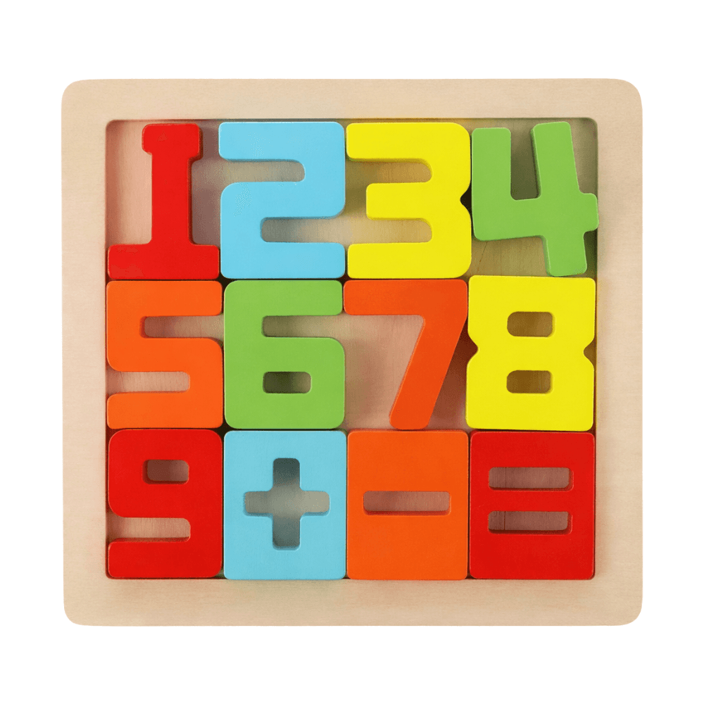 لغز تركيب خشبي بالأرقام مصمم لمساعدة الأطفال ابتداءً من 18 شهراً على التعرّف على الأرقام من 1 إلى 9 والرموز الرياضية، مع تنمية المهارات الحركية الدقيقة.