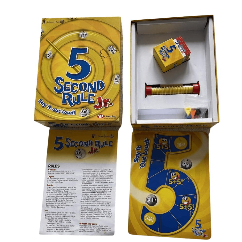 Ne manquez pas l’occasion de rendre chaque partie unique et dynamique. Faites de 5 Second Rule Jr. votre prochain jeu favori pour divertir vos enfants et toute la famille. Son concept simple, ses règles accessibles et son ambiance énergique en font un jeu incontournable qui restera un classique des soirées jeux pour enfants et parents.