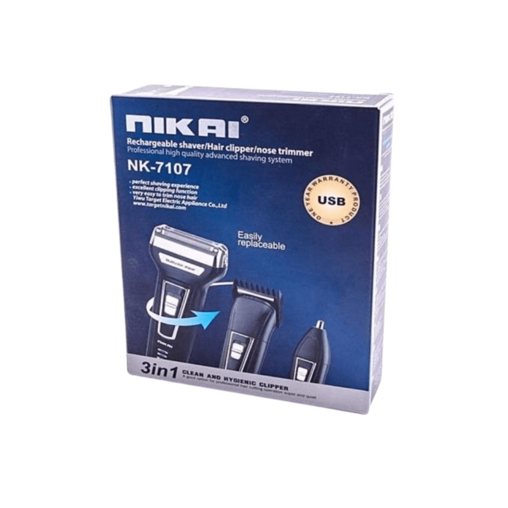 Découvrez le NIKAI NK-7107, Tondeuse rechargeable et multifonction 3-en-1 conçu pour simplifier et optimiser votre routine de soin quotidien. Représentant l’excellence et la polyvalence, ce kit complet intègre un rasoir électrique, une tondeuse à cheveux/barbe et une tondeuse nez/oreilles, offrant une solution unique pour une finition professionnelle de la tête aux pieds. Fini l’encombrement des multiples appareils : le NK-7107 est l’outil ultime pour un look toujours impeccable, que vous soyez à la maison ou en déplacement.